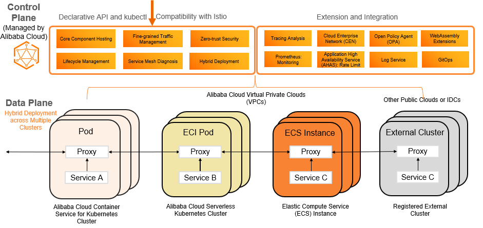 Alibaba Cloud Service Mesh (ASM) is a fully managed service mesh platform. ASM is compatible with the open source Istio service mesh of the Istio community. ASM allows you to manage services in a simplified manner. For example, you can use ASM to route and split inter-service traffic, secure inter-service communication with authentication, and observe the behavior of services in meshes. This way, you can greatly reduce your workload in development and O&M.