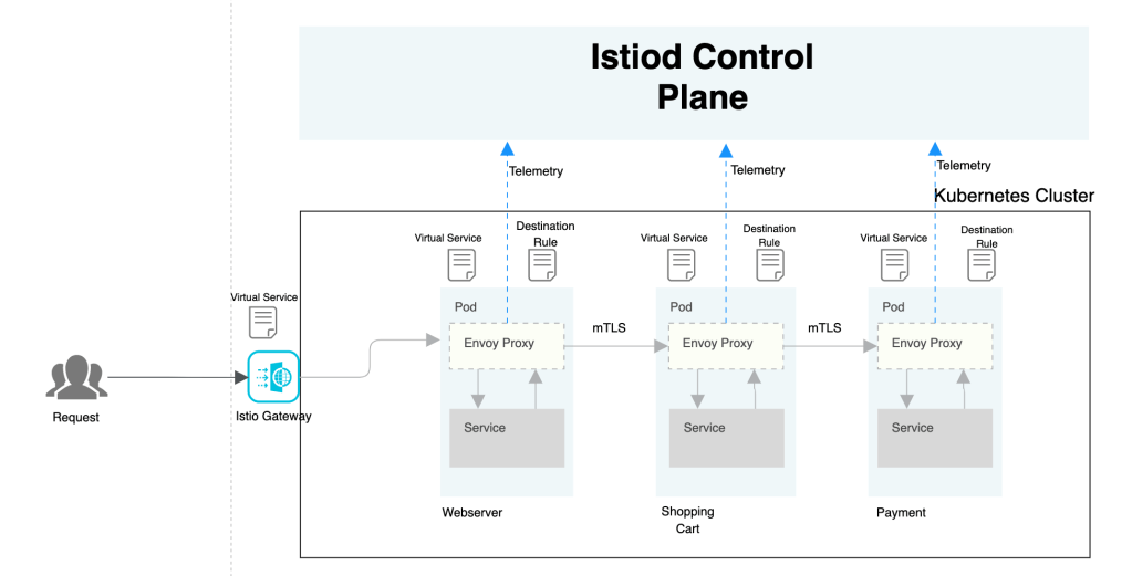 - Post processing the request, the webserver might want to call the payment service, in which case it will send the request back to its Envoy proxy which will evaluate the VirtualService rules and DestinationRules and then forward the request to Envoy proxy container of Payment service pod using mTLS.