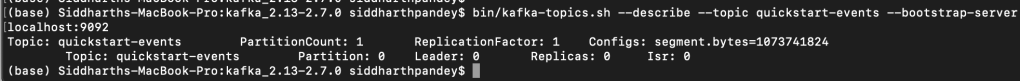 $ bin/kafka-topics.sh --describe --topic quickstart-events --bootstrap-server localhost:9092