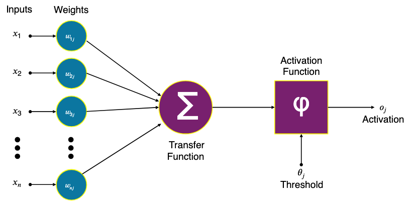 - Weighted Summation: Each input carries a weight which is multiplied together and result is summed together for all inputs through a transfer function.